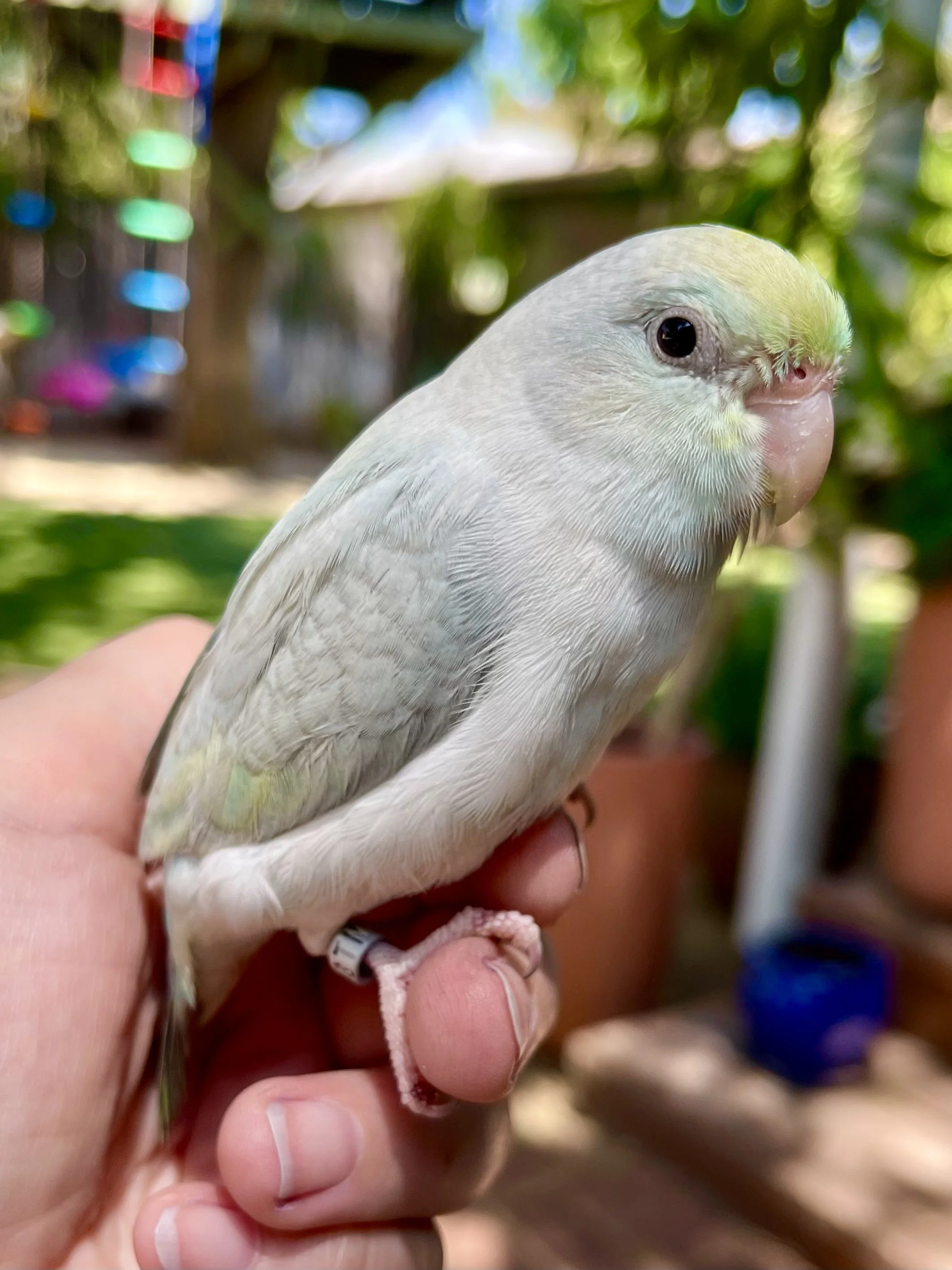 Sweet as pie, my true companion. Friends with all creatures. She prefers to be held and will run to the cage door to come out and play. She puts up with Fizzy’s feisty attitude and calms him with regular grooming and preening. She is a very loving mother. The trust she gives to me is priceless. Oh, and she is potty trained!